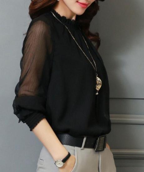 落ちついた印象の中に スタイリッシュ なシルエットと シースルー袖 が カッコイイ 長袖 シャツ ブラウスです。