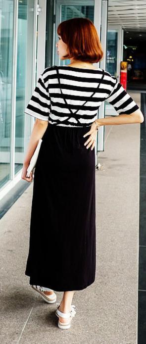 春夏らしいシンプルボーダーの半袖・五分袖の切り替えがキュートなゆったりロングワンピースです。