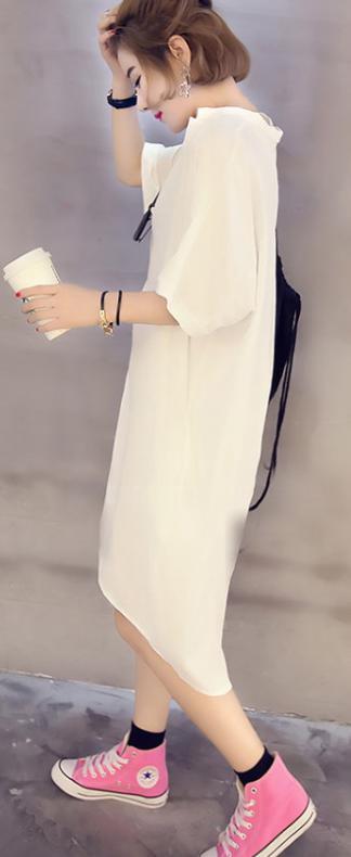 新品 春夏 ワンピ レディース ワンピース Vネック ロングシャツ 半袖 ホワイト Lサイズ ノーカラー シフォン 無地 カジュアル