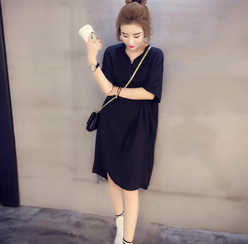 新品 春夏 ワンピ レディース ワンピース Vネック ロングシャツ 半袖 ブラック Mサイズ ノーカラー シフォン 無地 カジュアル