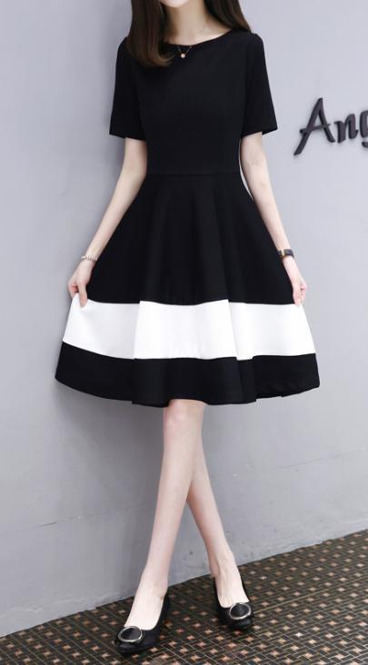 夏新作 シンプル 丸ネック 半袖 チュニック Aライン 体型カバー バイカラー ミドル丈 デートワンピース