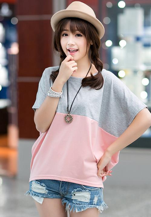 レディース Tシャツ カットソー 半袖 ラウンドネック モモンガ風 ドルマンスリーブ トップス ルーズ ゆったりめ 体型カバー 春 カジュアル おしゃれ シンプル ツートンカラー バイカラー 可愛い かわいい 女性用 婦人用