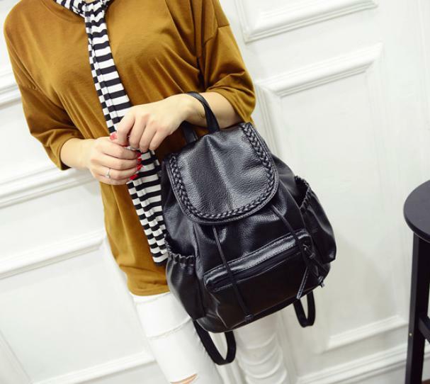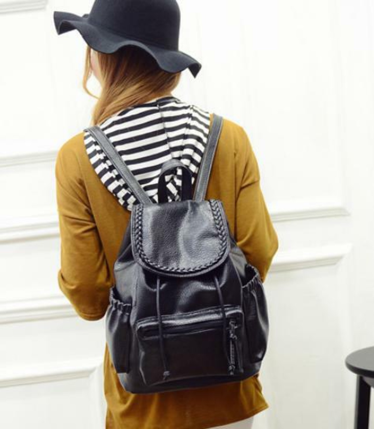 レディース リュックサック PU レザー 黒 シンプル かっこいい カジュアル 巾着 かぶせタイプ前側ポケット 小さめ ショルダー トート リュック オールシーズン